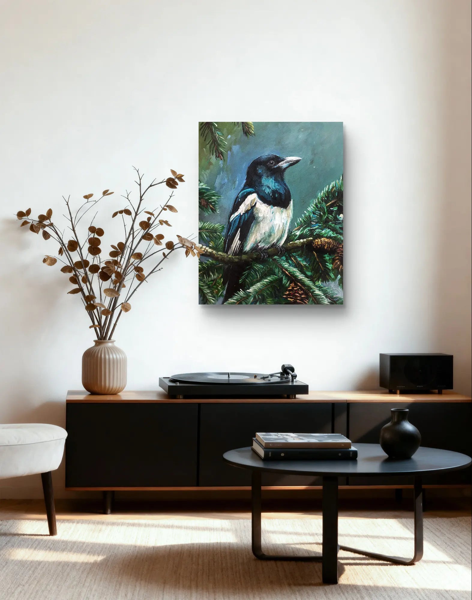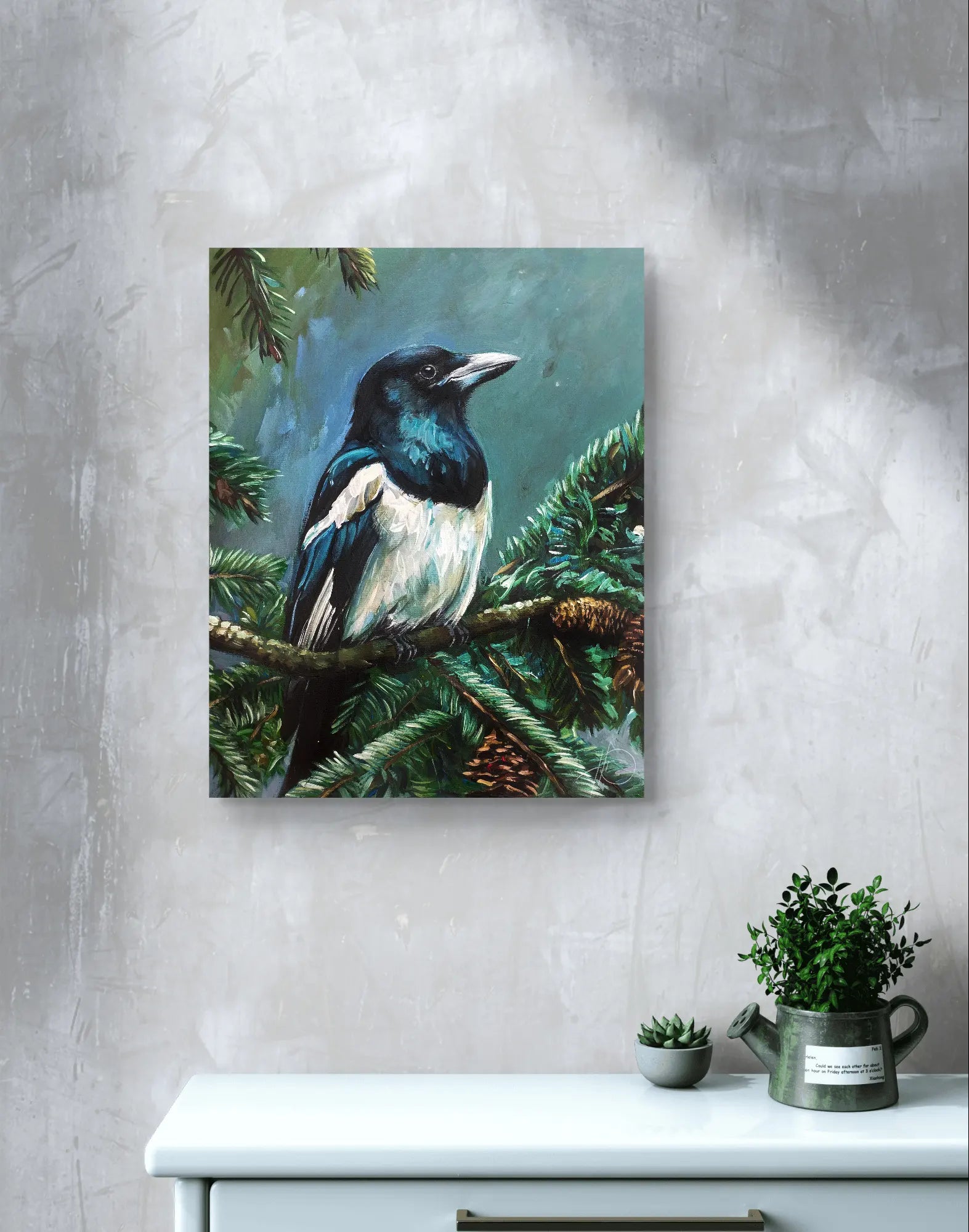 If you're interested in purchasing this hand-painted acrylic painting of a magpie, this work is the perfect choice for art lovers and collectors. Bring color and emotion to your rooms – secure this expressive original artwork today!