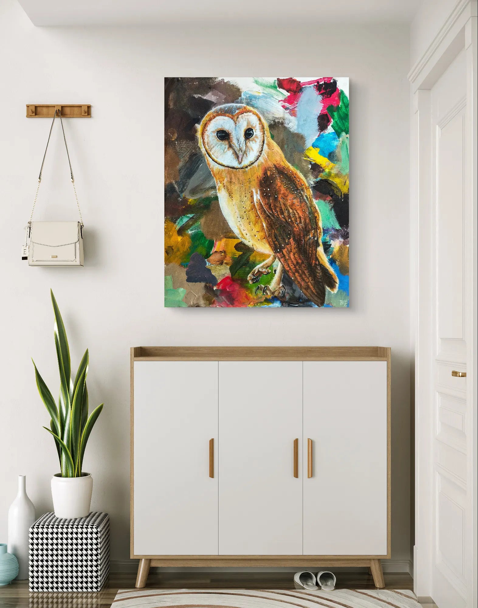 Dieses handgemalte Acrylbild zeigt eine anmutige Schleiereule in lebendigen, ausdrucksstarken Farben, die eine fröhliche und inspirierende Atmosphäre schaffen. Das sorgfältig gefasste Federkleid und die eindrucksvolle Mimik der Eule ziehen sofort alle Blicke auf sich und bringen spürbar positive Energie in jeden Raum. Dieses Kunstwerk eignet sich perfekt als Herzstück, um einen individuellen und künstlerischen Stil zu unterstreichen.