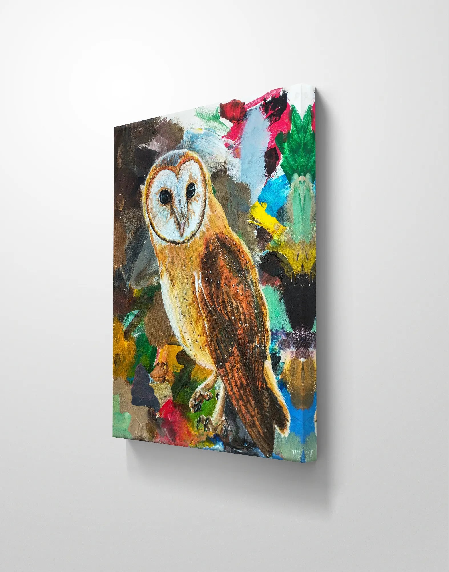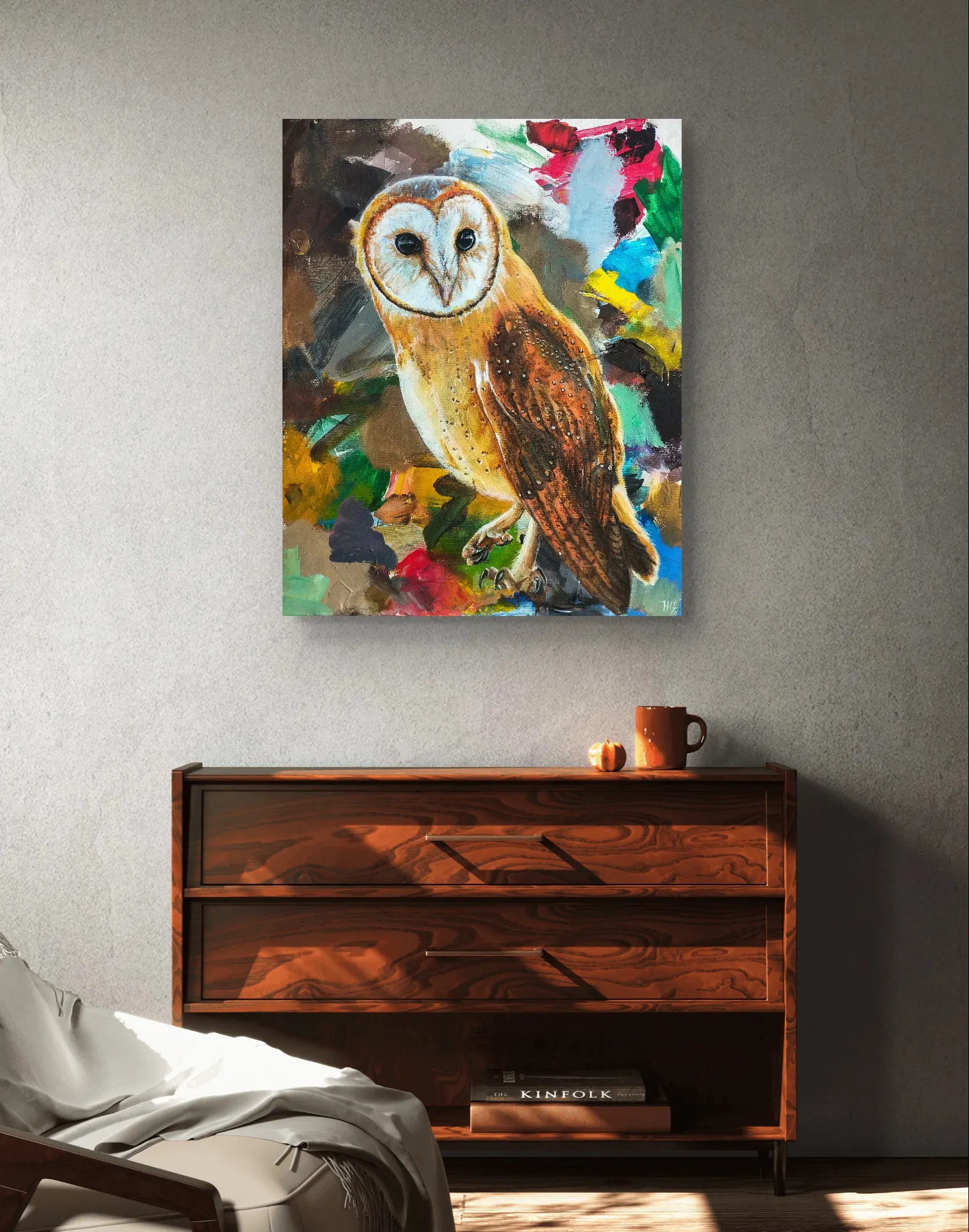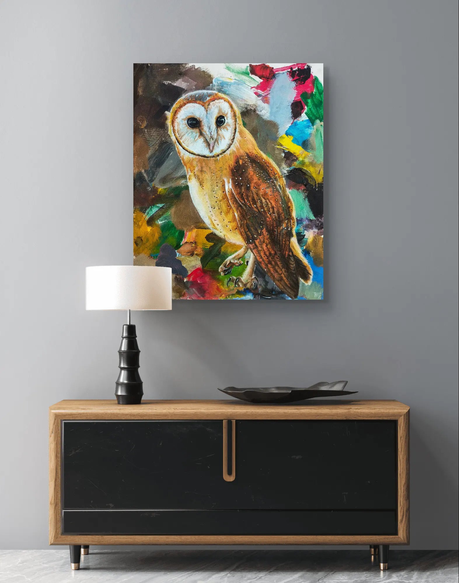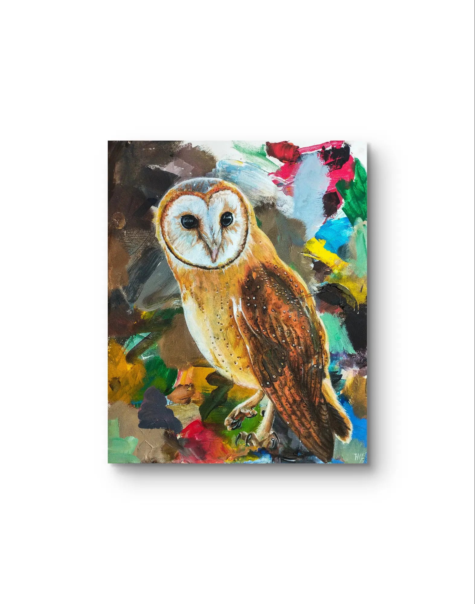 Inspiriert von der geheimnisvollen Ausstrahlung der Schleiereule, strahlt dieses Werk Freude und Wärme aus. Seine farbenfrohe Komposition lädt jeden Tag zum Lächeln ein und verleiht Wohnzimmer, Büro oder Galerie ein faszinierendes Flair.